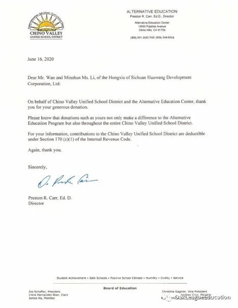 3月美國疫情爆發時,學區並沒有足夠的醫護用品,口罩更是非常缺乏。萬董事長的即時捐贈,學區有了醫療物資,發放定點供應的學生午餐員工,終於有了保護。Dr. Carr多次拜訪中國,也到過成都,他非常喜歡國內人的熱情,也希望能盡快再次拜訪中國,同時也很期待及歡迎萬董事長女兒Julian Yulin今年秋季來我們學區就讀, 並且代表學區歡迎萬董事長夫妻再次來我們學區拜訪。